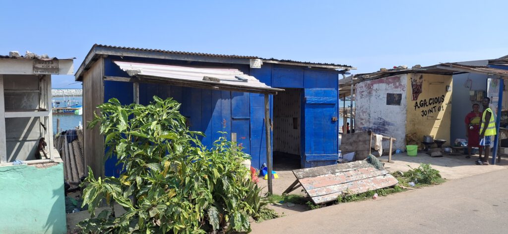 2022, als der Laden noch gelb war, wurde der schöne Sandstrand durch einen Steinwall ersetzt. Grund: Der Meeresspiegel könnte weiter ansteingen. Und die holländischen Planer haben in Elmina gleich zwei Steinwälle bauen lassen, so dass ein neuer Hafen entstand.