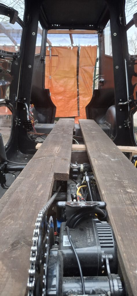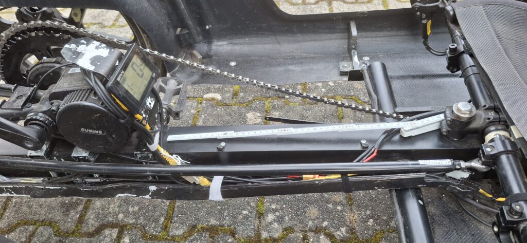 Mein Quadvelo soll umgebaut werden. Nach dem Einbau eines Bafang-Motors BBS02B – G340 (36 V, 250W/500W Drehmoment max. 100 Nm) mit einem Bafang-52T-Kettenblatt, an welchem ein Kettenblatt mit 56 Zähnen angeschraubt ist, soll jetzt wegen des erheblich höheren Übersetzungsspektrum noch ein Pinion-Getriebe C1.12 mit Lenkerend-Schalthebel eingebaut werden. D.h. es muss die Kettenschaltung ausgebaut und das Differenzial in der Hinterachse ausgetauscht werden, was nur beim Hersteller Velomo gemacht werden kann.