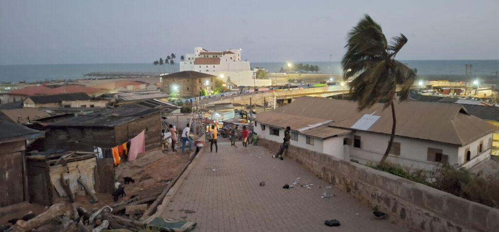 Blick vom Fort St. Jago auf die Elmina Castle am Abend 9/2025